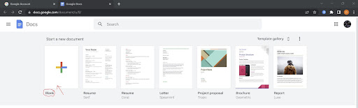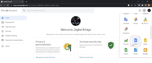 Once you have created your gmail account, click on the side icon as shown above and scroll down until you see the Google Docs logo.