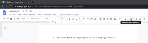 Click on the 'Numbered List' button (found on the right end of the tool bar) to create a list with numbers.