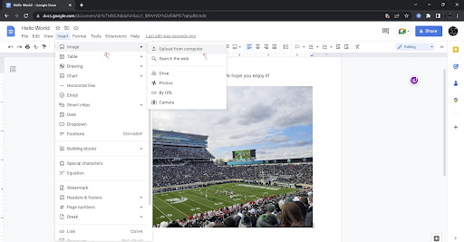 To insert an image: hover over the image tab as the arrow shows and then click on upload from the computer and choose an image that you would want to upload from your folders.
