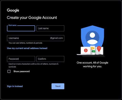 In Google Chrome type in “Google Sign Up” there should be a link that says “Create a Gmail Account”. By clicking on this link and pressing the button “Create Account”, you should see the following information above.