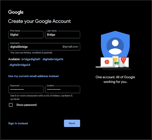 If you have a hard time creating an email yourself, google will try to offer suggestions based on what you wrote in order to give you a unique name. This is indicated above with the blue words after “available”.
