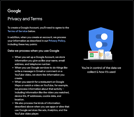 Finally, there will be a “document” that lays out the Policy and Terms, which is the rules and regulations of Google's services. Hit I agree once you have looked over them.