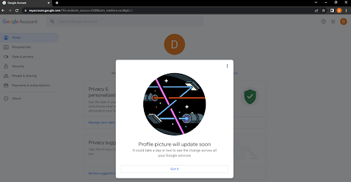 To add a profile pic please click the icon that has the first letter of your name, followed by “Manage Google Account”